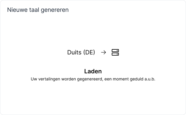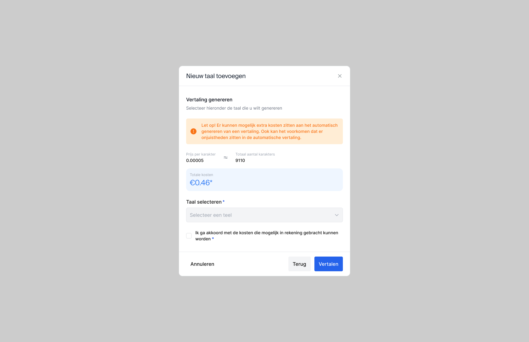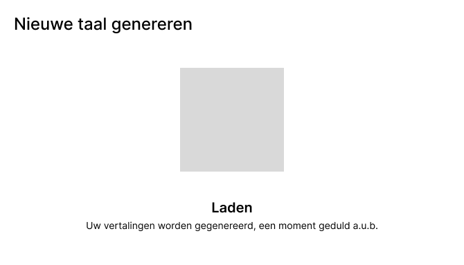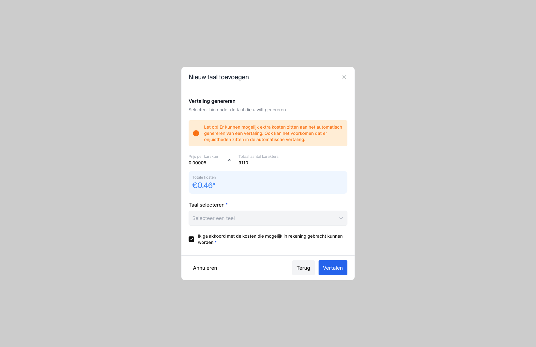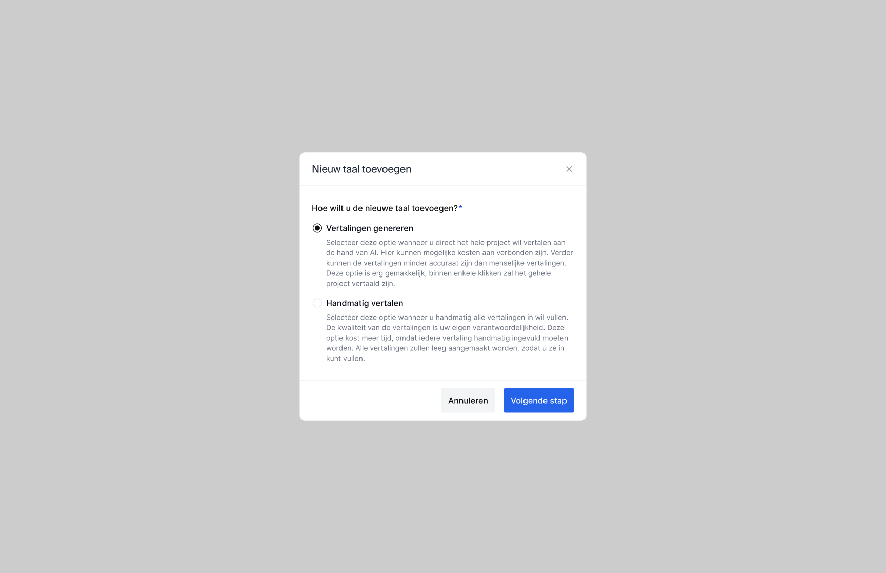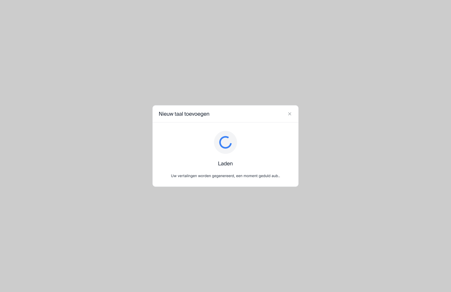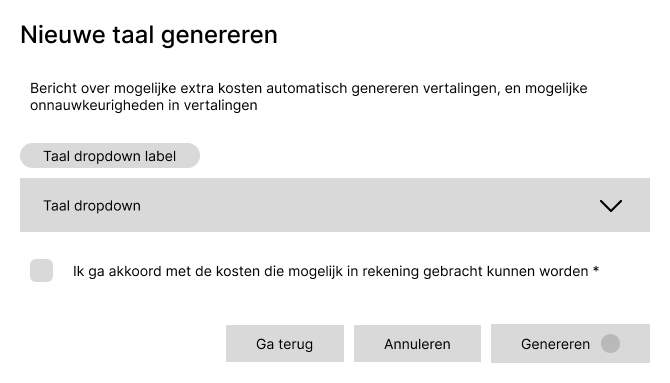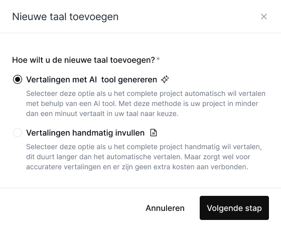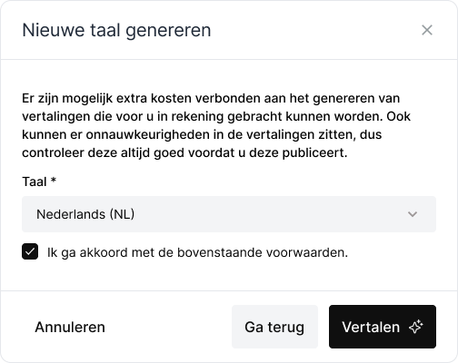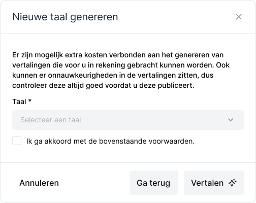Deze modal wordt zichtbaar wanneer er in de vorige modal de optie "Vertalingen met AI tool genereren" wordt geselecteerd, en hierna op de "Volgende stap" knop wordt geklikt.