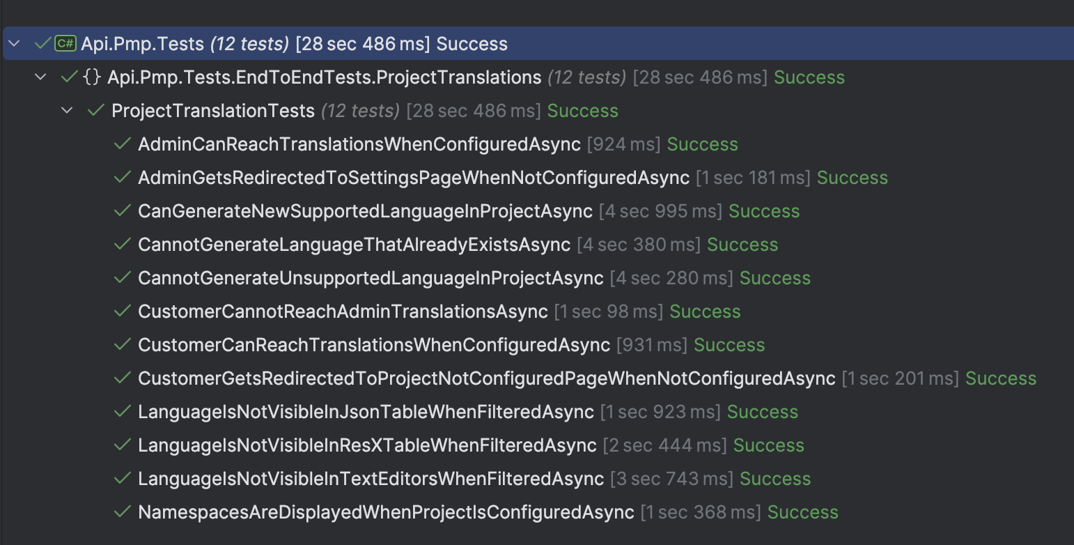 Er is gekozen om end to end tests te schrijven voor deze use case, omdat het genereren van de vertalingen een complex proces is. De meest gemakkelijke manier om alle scenario's te testen is door de flow van de use case te testen. Omdat de back-end en front-end in verbinding met elkaar staan aan de hand van de API endpoints, is het belangrijk dat deze verbinding goed werkt. De end to end tests valideren of de flow van de use case werkt, en of de back-end en front-end goed met elkaar communiceren.