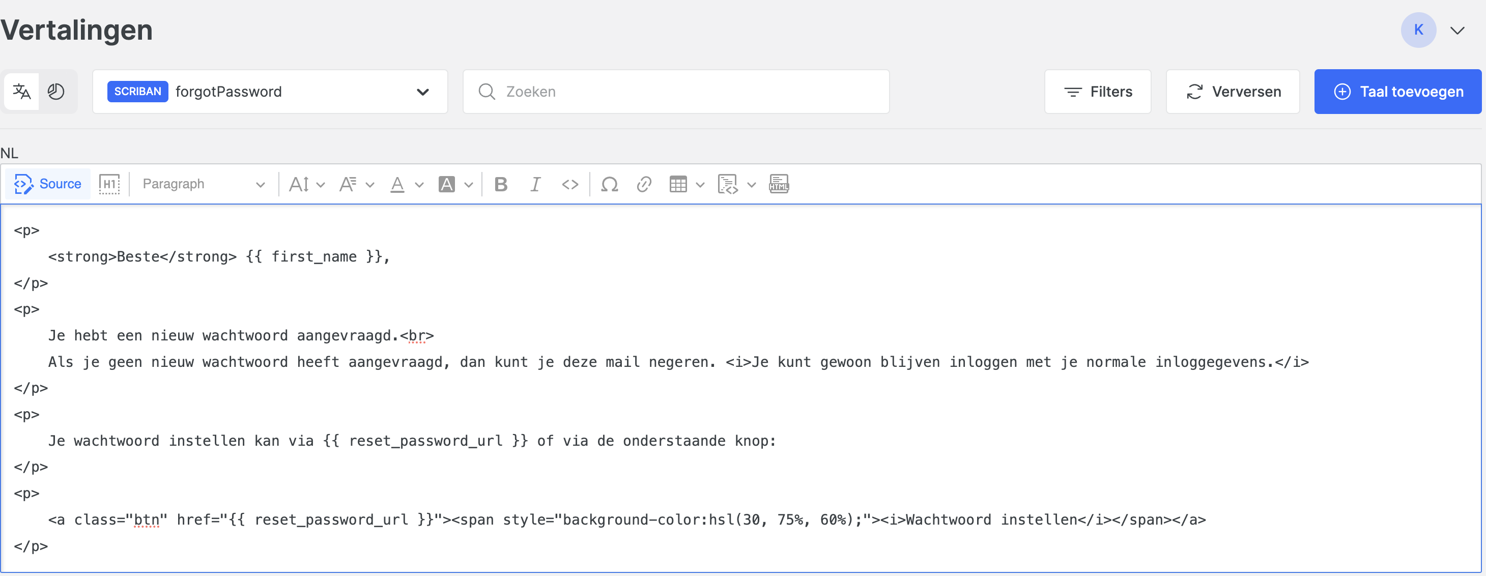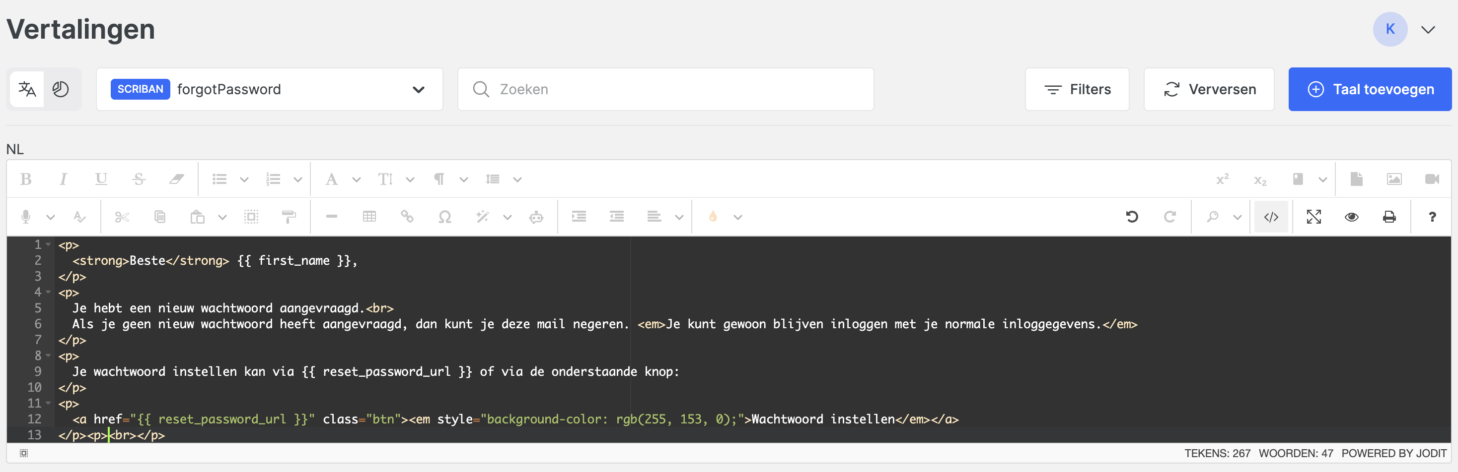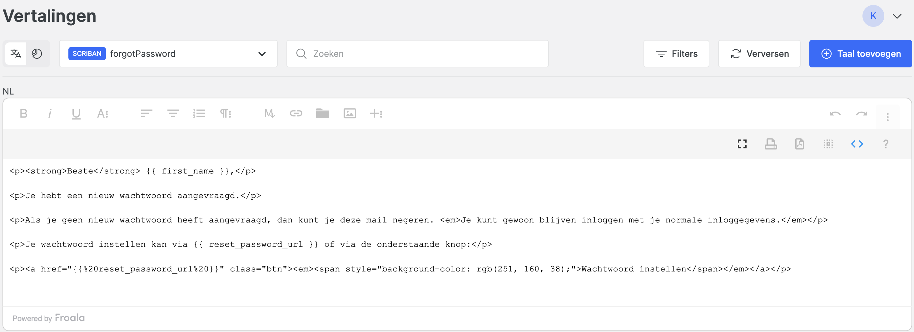 Voor Bluenotion wordt een portaal ontwikkelt waarin vertalingen beheerd kunnen worden. Het portaal ondersteunt JSON vertalingsbestanden die in een tabel weergeven worden, waarin de vertalingen beheerd kunnen worden. Er is nu een wens naar boven gekomen om Scriban vertalingsbestanden te ondersteunen. Scriban is een template engine die gebruikt wordt om vertalingsbestanden te genereren. De vertalingsbestanden worden in een HTML formaat opgeslagen. Om de vertalingsbestanden te kunnen beheren is er een HTML text editor nodig die de HTML opmaak ondersteunt. Bluenotion gebruikt de Scriban bestanden tot nu toe alleen voor email templates.