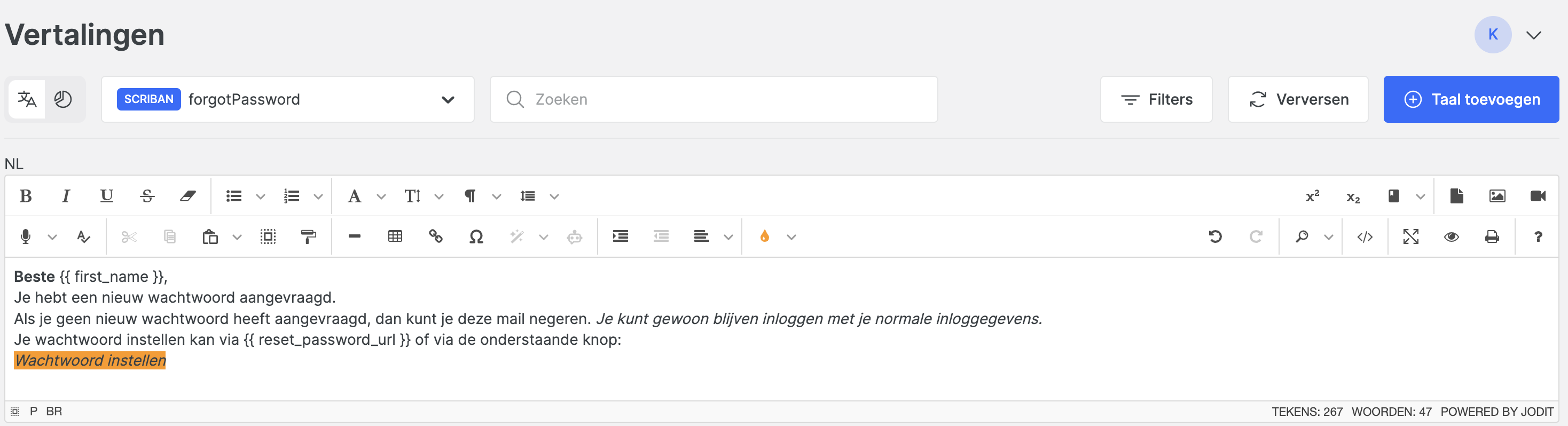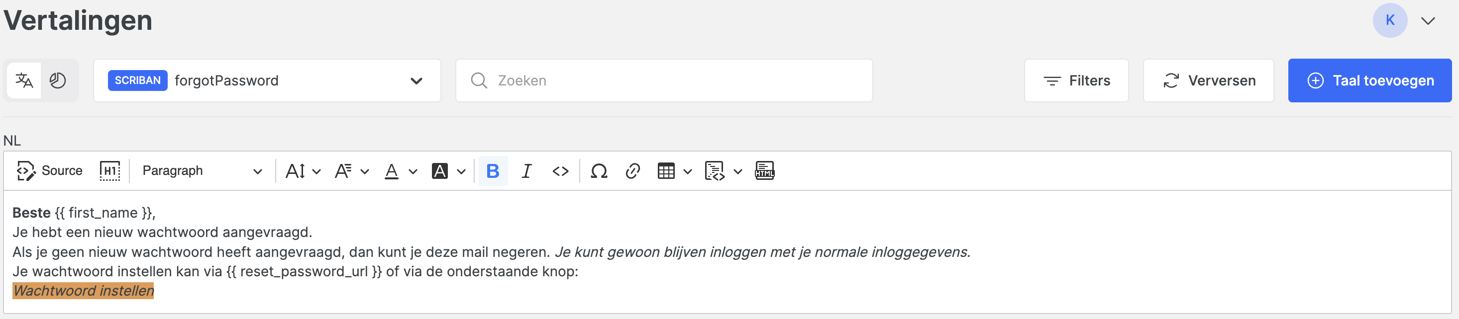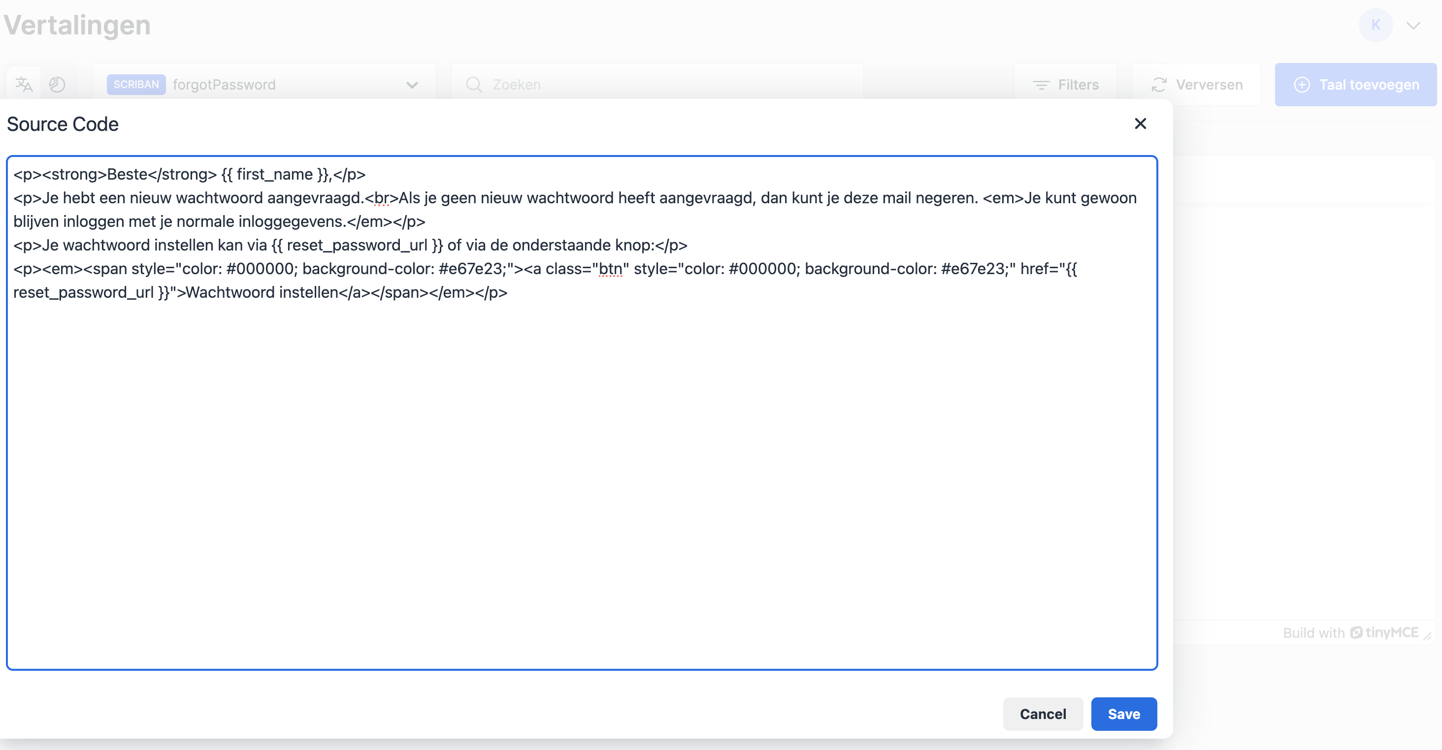 Voor Bluenotion wordt een portaal ontwikkelt waarin vertalingen beheerd kunnen worden. Het portaal ondersteunt JSON vertalingsbestanden die in een tabel weergeven worden, waarin de vertalingen beheerd kunnen worden. Er is nu een wens naar boven gekomen om Scriban vertalingsbestanden te ondersteunen. Scriban is een template engine die gebruikt wordt om vertalingsbestanden te genereren. De vertalingsbestanden worden in een HTML formaat opgeslagen. Om de vertalingsbestanden te kunnen beheren is er een HTML text editor nodig die de HTML opmaak ondersteunt. Bluenotion gebruikt de Scriban bestanden tot nu toe alleen voor email templates.